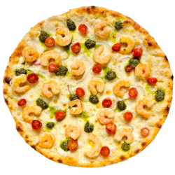 White Garlic Sauce, Mozzarella, Marinated Prawns, Red Onion, Cherry Tomato, Pesto, Crushed Red Pepper Flakes, Lemon